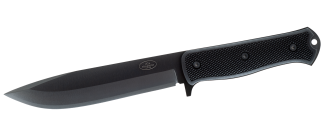 The Fallkniven A1 is an all-purpose knife on the larger side designed for heavy duty use. The powerful blade is made of extremely hard and tough laminated VG10 steel, and will withstand the stress of hard use. The knife is superb at chopping as well finer daily cutting tasks thanks to the ergonomic grip. The full tang goes entirely through the handle so you can strike with the end of it without breaking the grip. The sturdy black leather sheath allows you to fasten the knife on your belt or your pack, and even upside down. The Fallkniven A1 is unaffected by water and works equally well in extreme cold and stifling heat. Choose between a Zytel sheath or a black dangler type leather sheath.