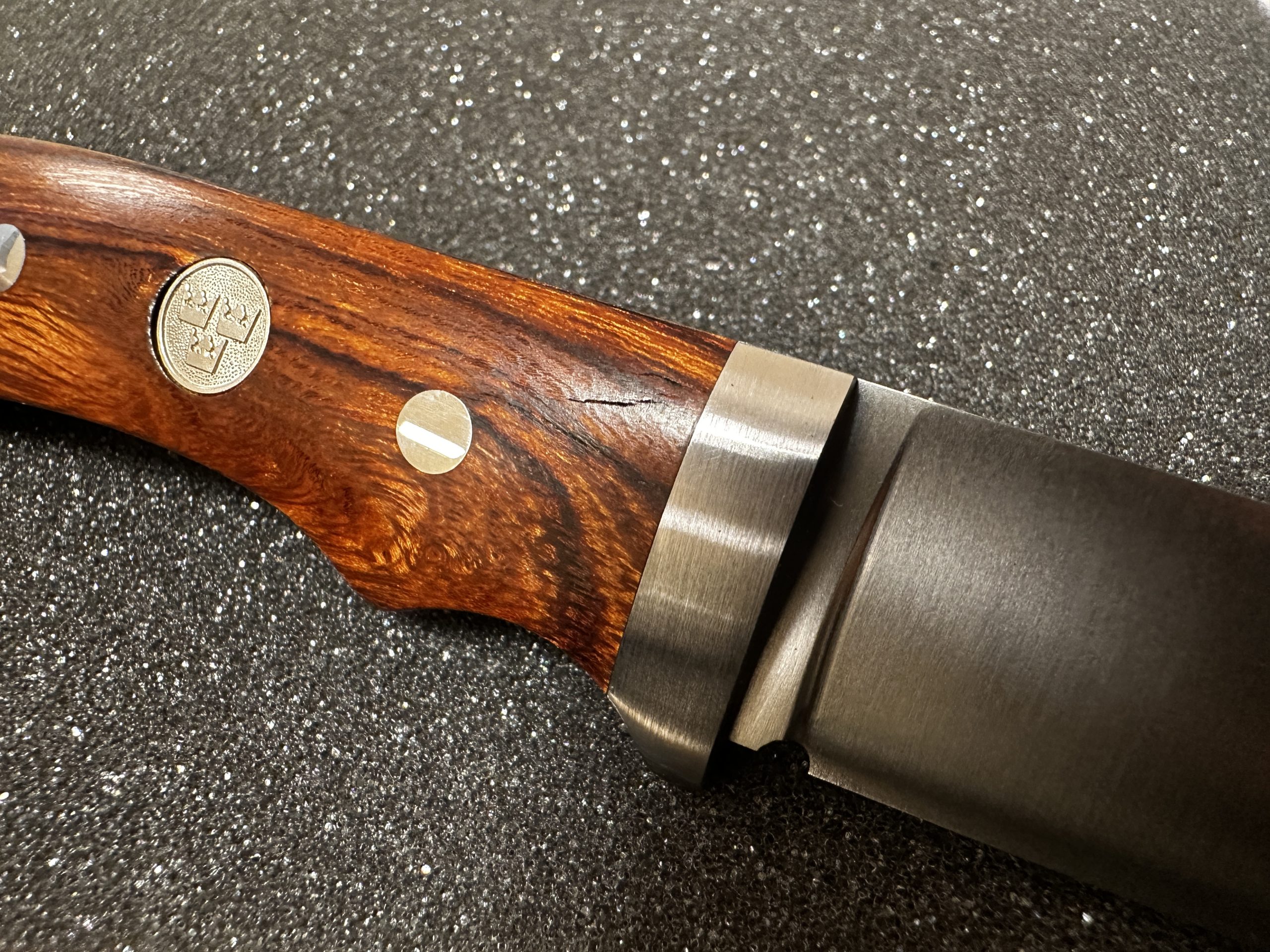 Reduced price due to cracks in the wooden handle. See photos for reference. Leather sheath included. Sold without giftbox.